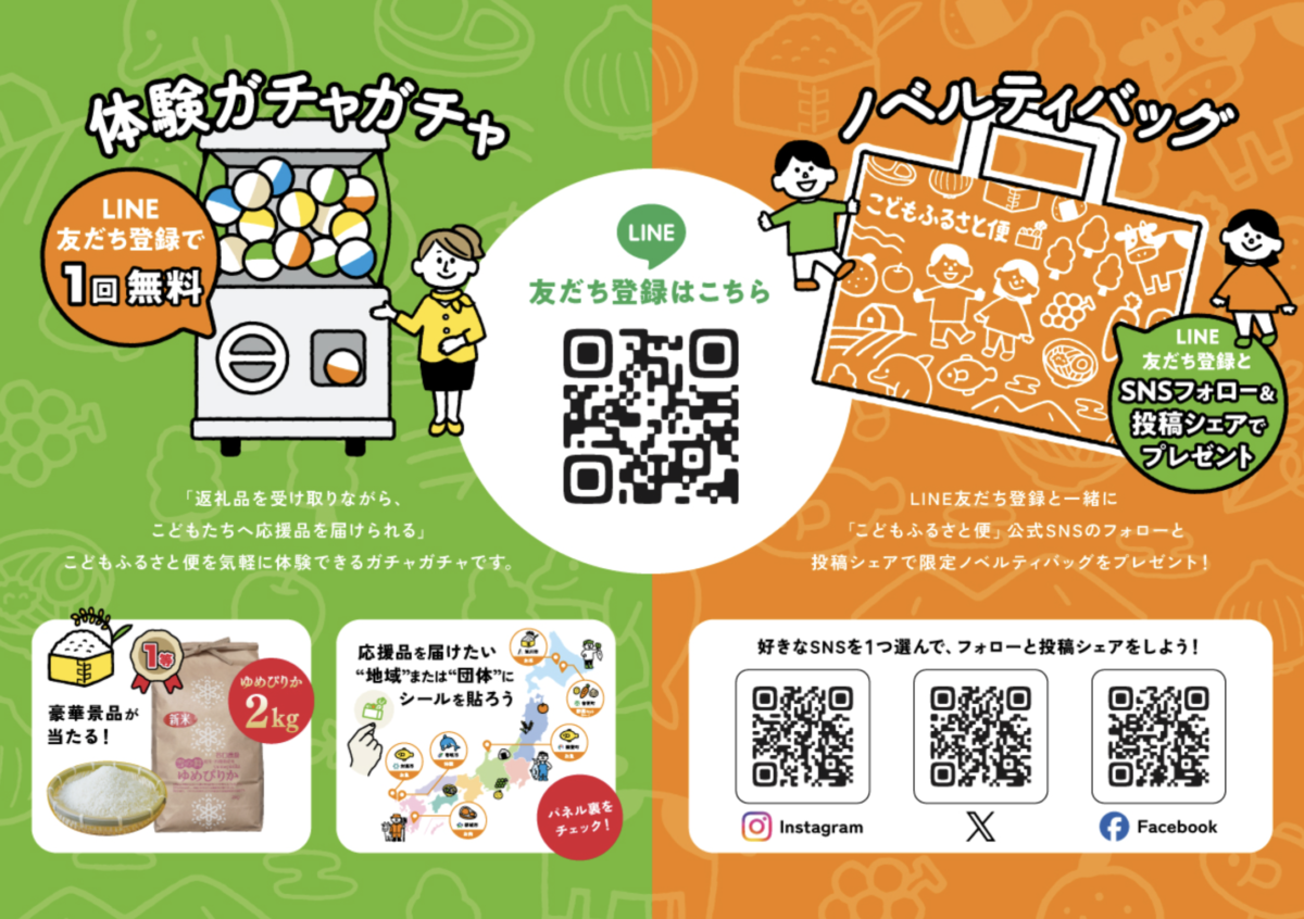 「こどもふるさと便」のLINE友だち登録で参加でき、実際の返礼品が当たります。また、自分が応援品を届けてもらいたい地域や団体にシールで投票し、一連の流れを体験できる仕組みです。