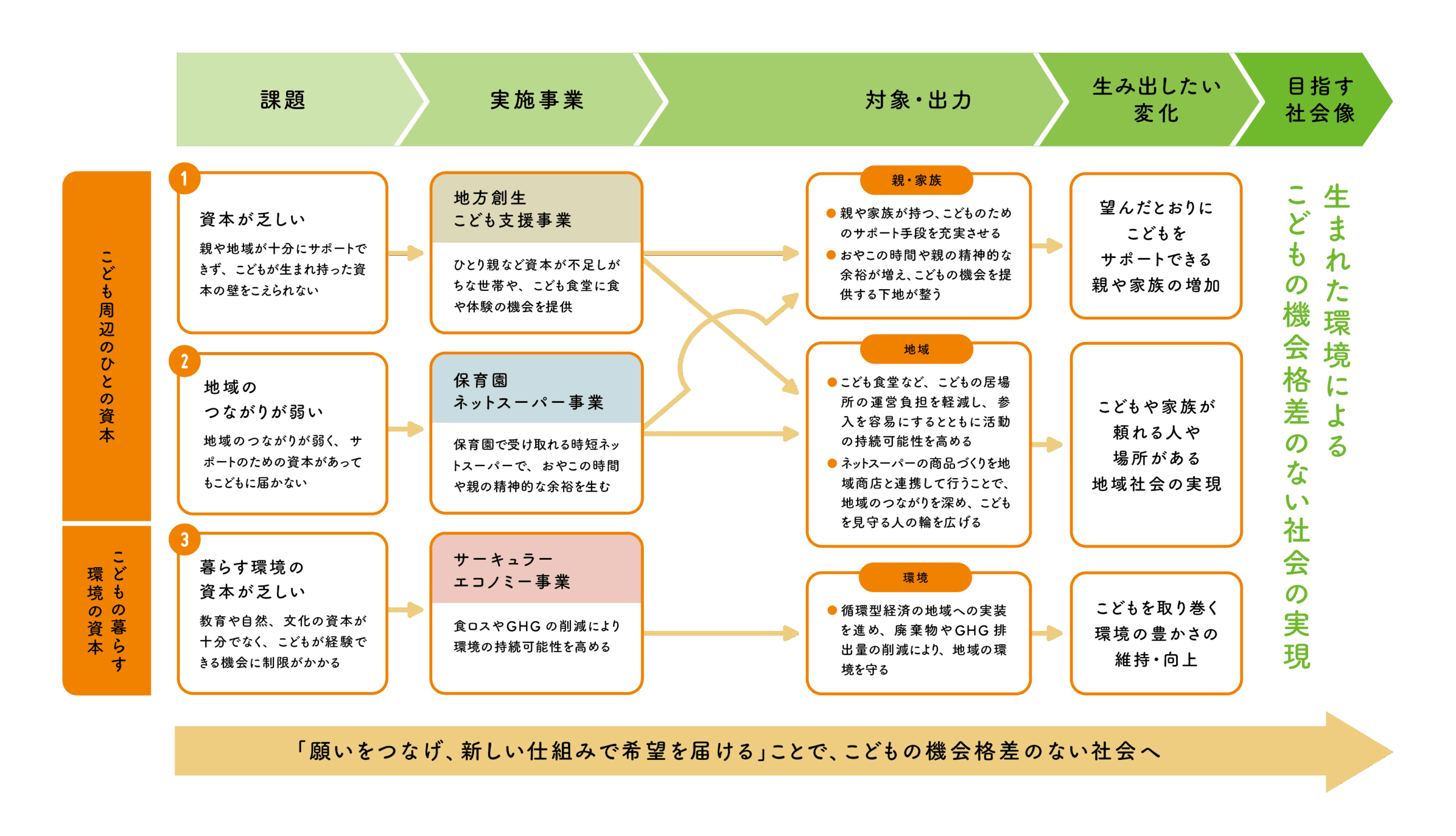 わたしたちネッスーが何を課題としてとらえ、どんな事業を行い、どのように「こどもの機会格差のない社会」を実現しようとしているのか、社会に変化を起こす過程をひとつの 図にまとめました。