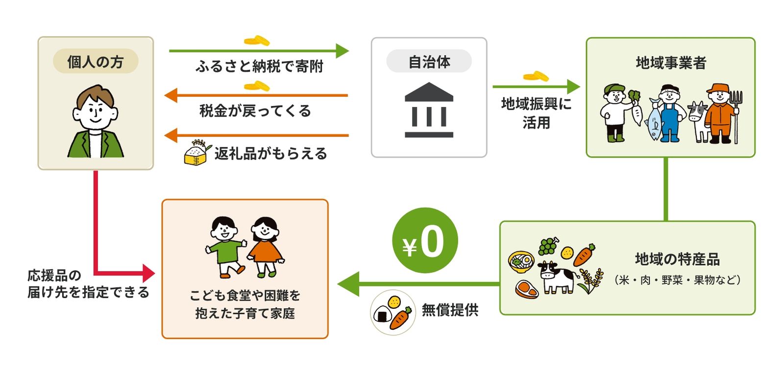 「こどもふるさと便」は、ふるさと納税を通じて、地域の特産品や体験を“応援品”として、こども食堂やひとり親家庭、難病と向き合うこどもたちなどに届ける仕組みです。